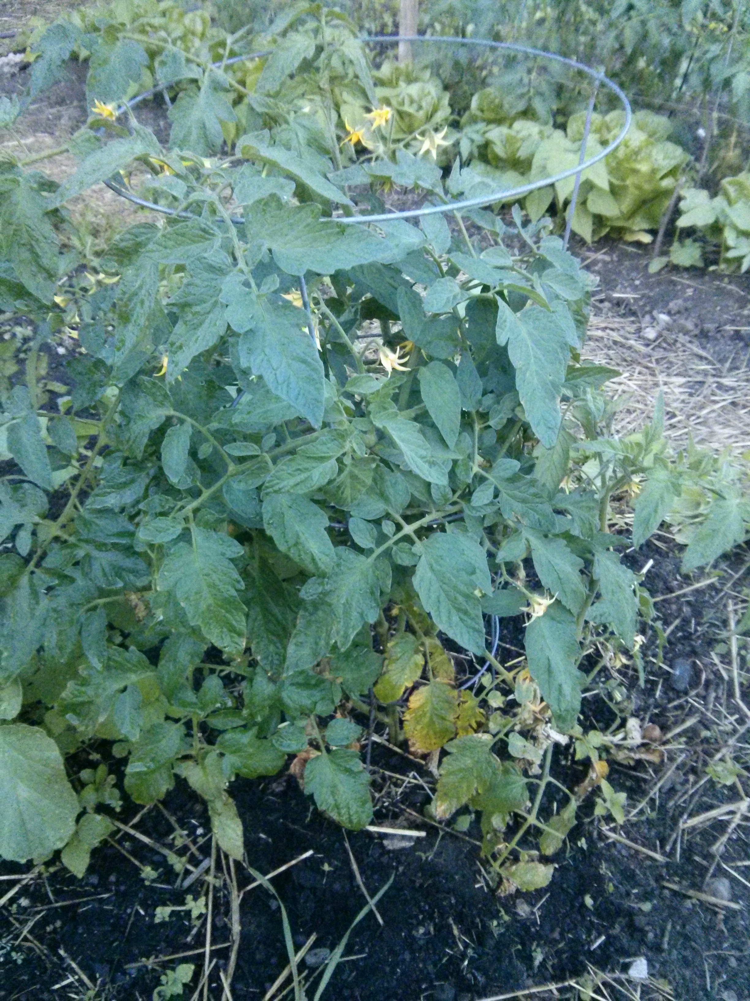 Also involved: a bamboo pole, a plastic stake, a metal stake, and an unfolded  tomato cage. (Thank you Mom for the complementary, non-twine supplies.)