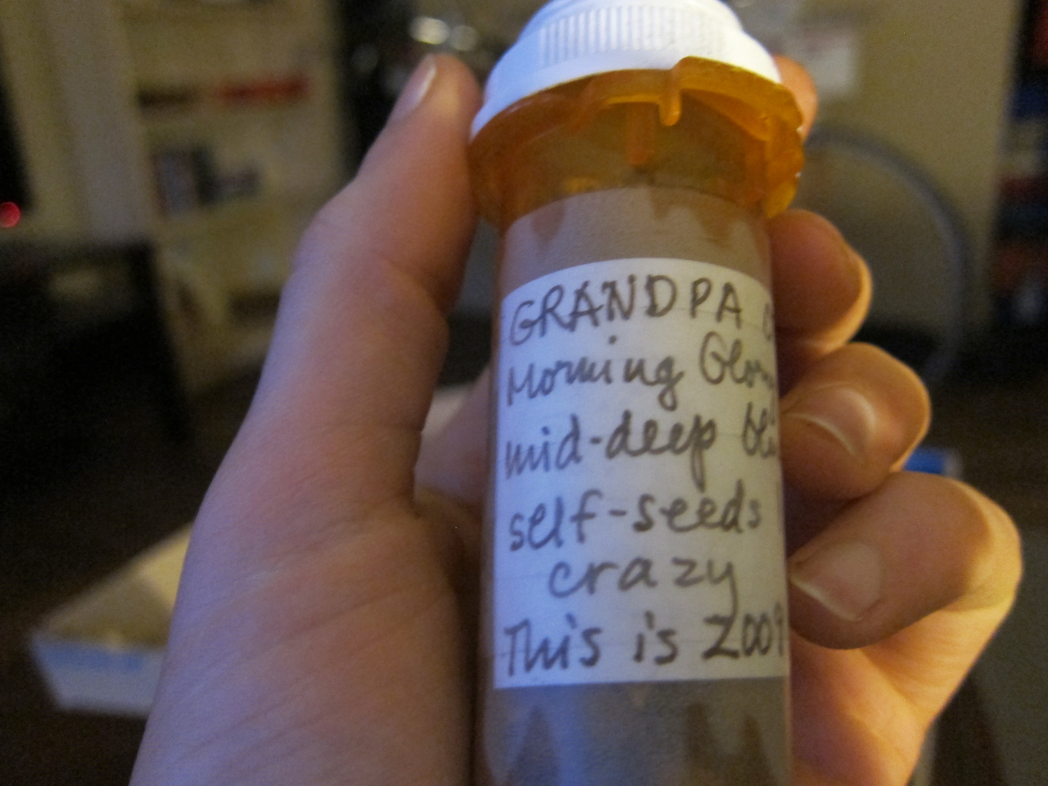 The box also contained some interesting odds and ends, like a ziploc bag full of marigold seeds, a bent spoon container with sunflower seeds, a small folded paper with some chives seeds, and a medicine bottle with Grandpa Ott Morning Glory seeds.
