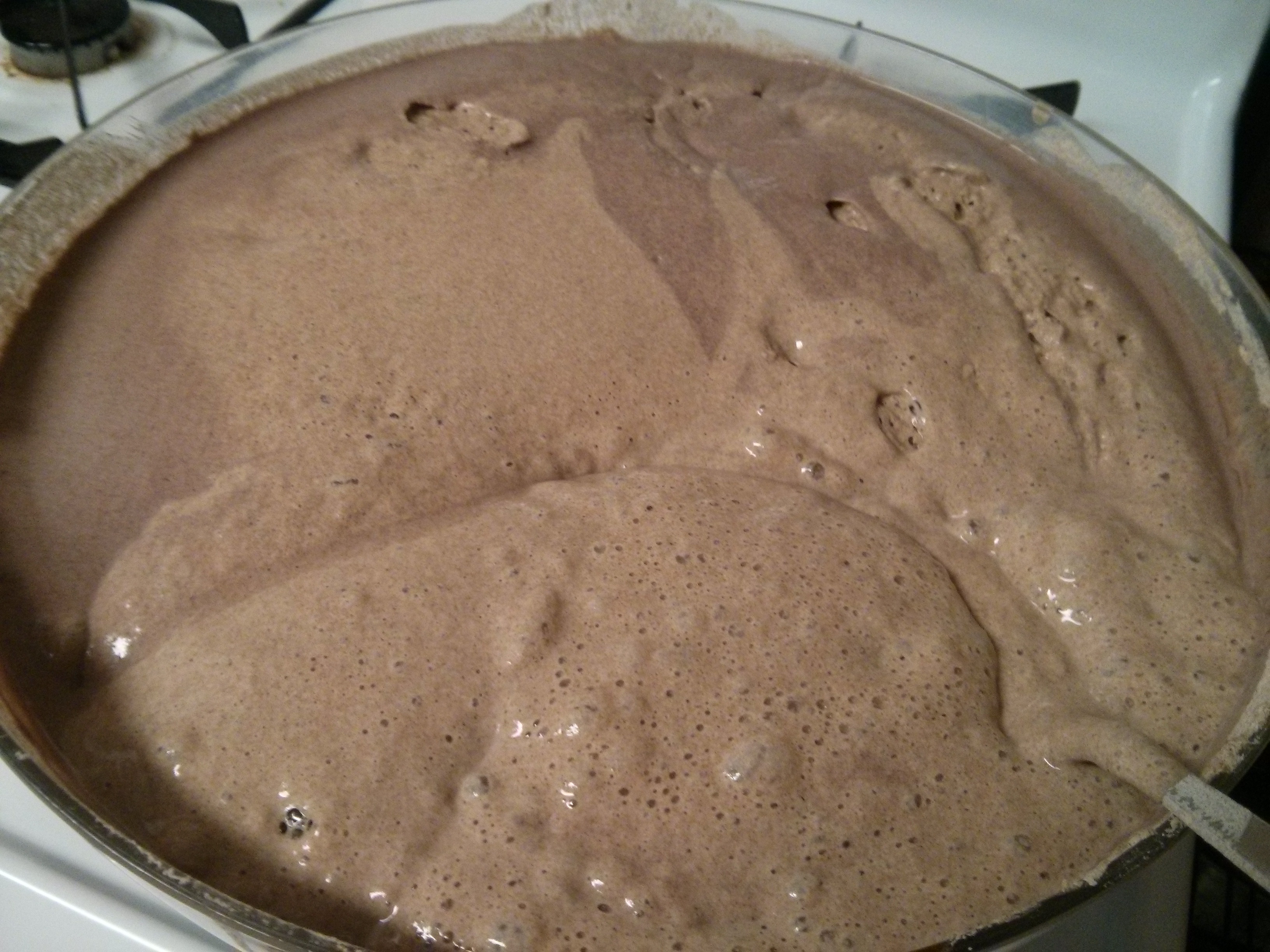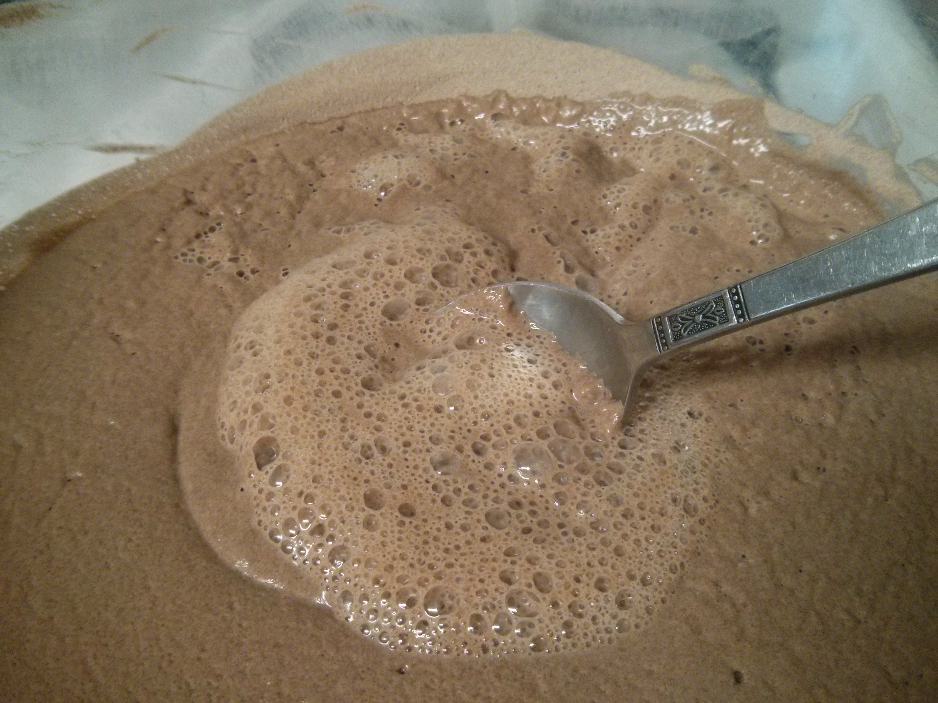 The injera batter, half a day later – with a thick, chocolate mousse-like consistency (until I mixed it).