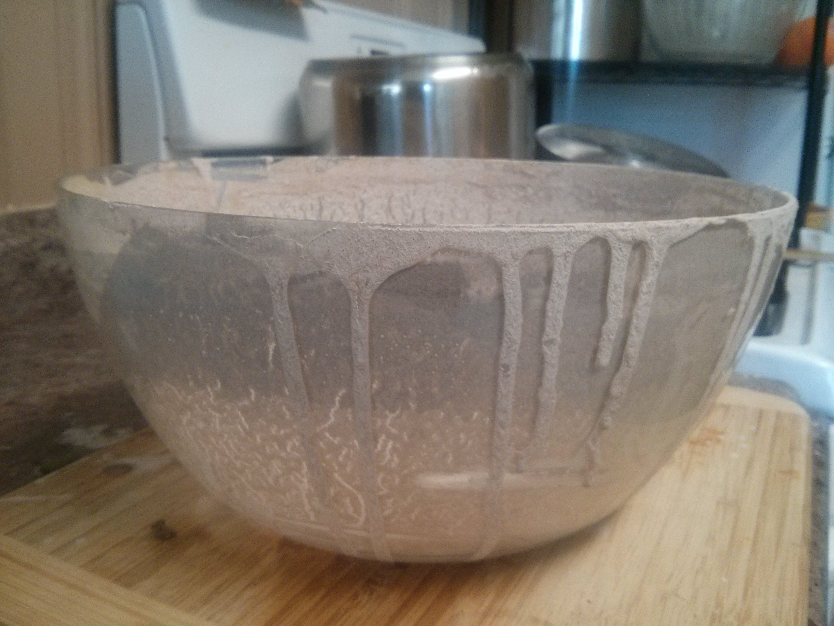 Let us see, what here do we have… A large bowl, used for something. The contents – empty, with a film remaining, dried. Used recently, a batter of some type, yes last night! A cutting board, similarly splattered, an upturned pot and pan behind. But why upturned? The shelves past the stove, full, a recently used bowl, close, yes the dishes! Not cooking now, but the morning after, the dishes all done but one, a bowl to go. Dish rack full, pots inverted, pots in place, pots not in place, yes pots drying! The bowl, posing, waiting, take my picture, speaking what? To the brim, over, no more, no matter, well used, well spent, alive, and dried.