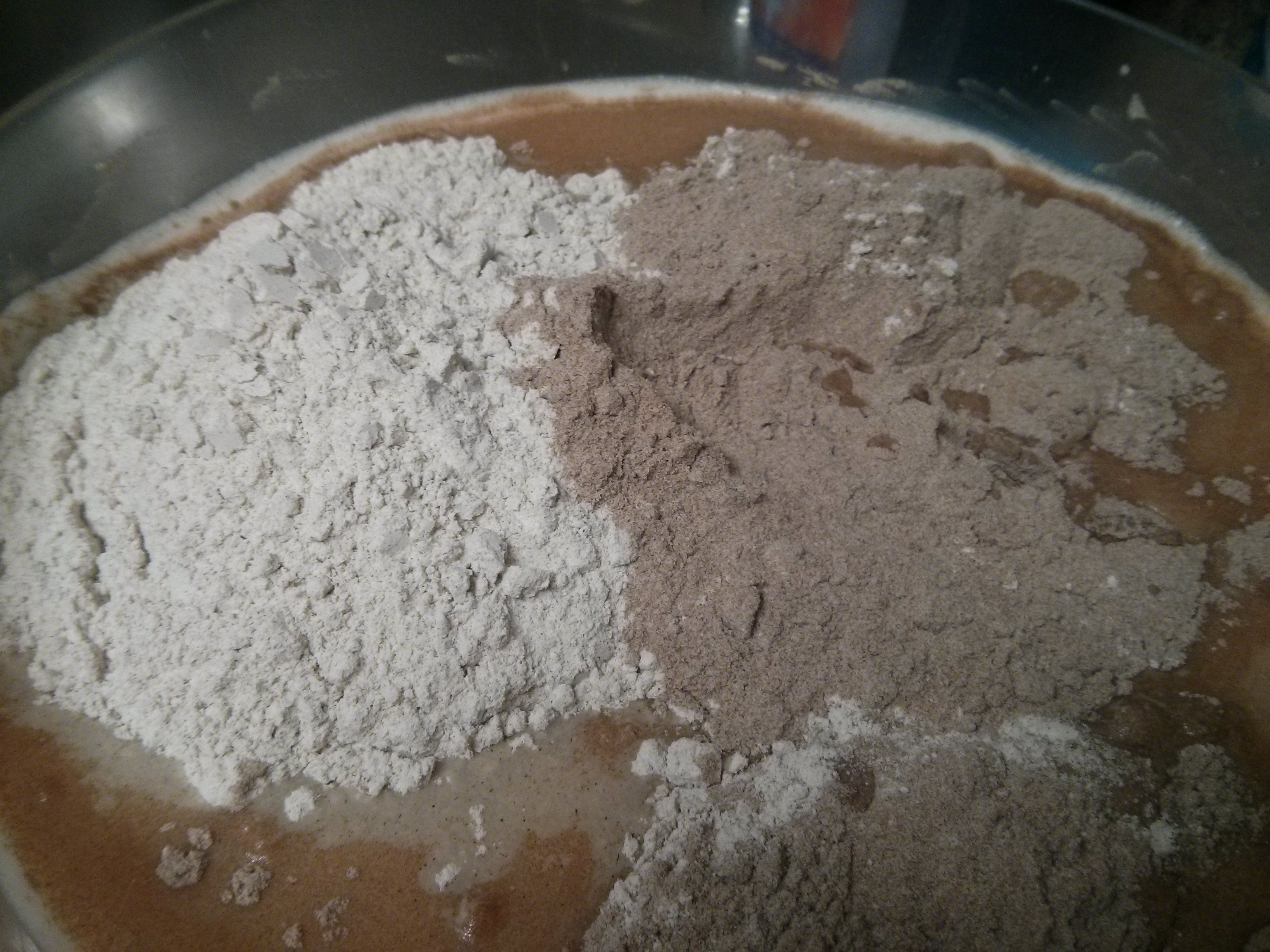 The starter at step 1 – the teff flour and water, doing a good imitation of chocolate pudding mix.